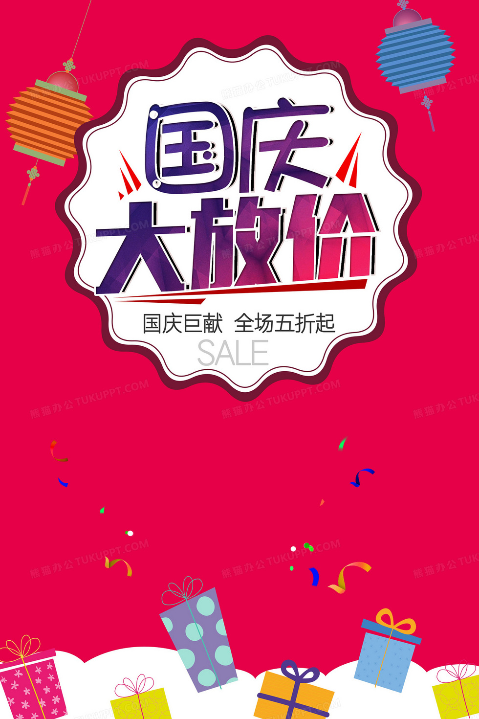 本作品内容为国庆大放价背景, 格式为 jpg, 图片尺寸为3544 x 5316, 作品中背景图片无需修改, 源文件无水印,可以直接使用, 欢迎使用熊猫办公。 如认为平台内容涉嫌侵权,可通过邮件:tousu@tukuppt.com提出书面通知,我们将及时处理。