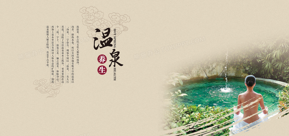 本作品内容为温泉养生背景图, 格式为 psd, 图片尺寸为1920 x 900, 作品中背景图片无需修改, 源文件无水印,可以直接使用, 欢迎使用熊猫办公。 如认为平台内容涉嫌侵权,可通过邮件:tousu@tukuppt.com提出书面通知,我们将及时处理。