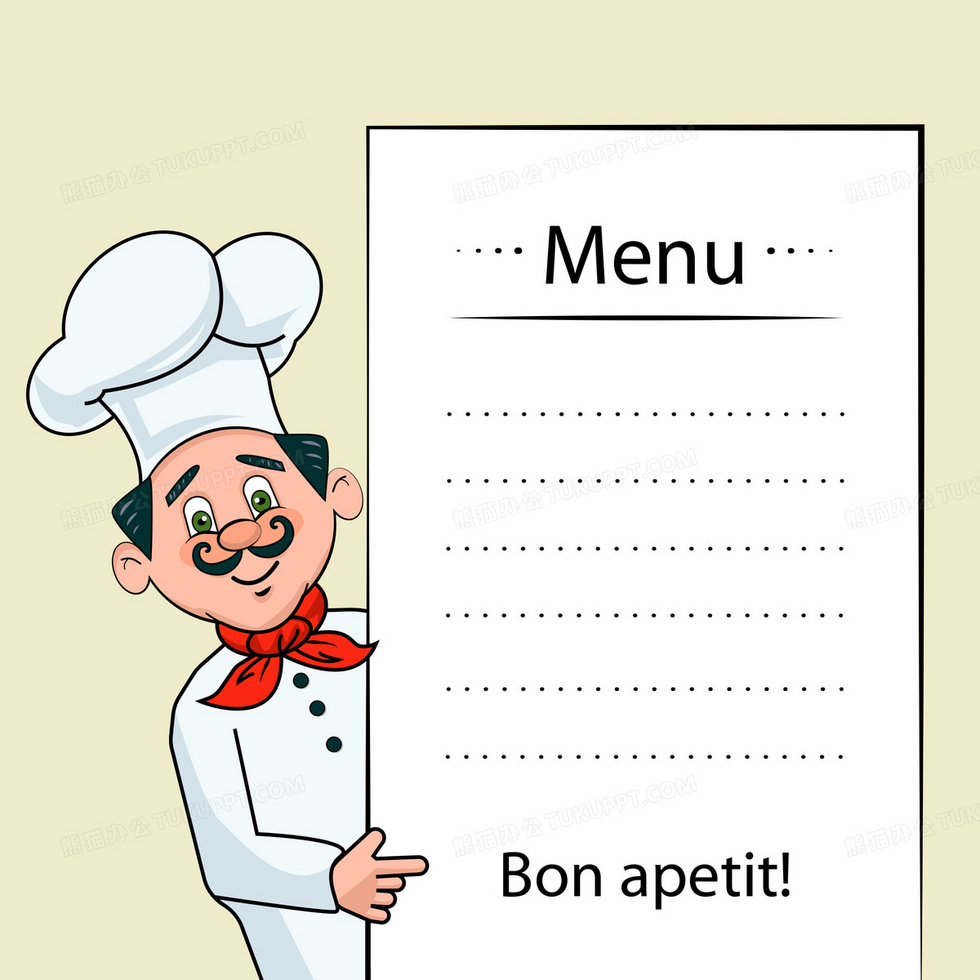 本作品内容为卡通厨师菜单, 格式为 ai, 图片尺寸为2000 x 2000, 作品中背景图片无需修改, 源文件无水印,可以直接使用, 欢迎使用熊猫办公。 如认为平台内容涉嫌侵权,可通过邮件:tousu@tukuppt.com提出书面通知,我们将及时处理。