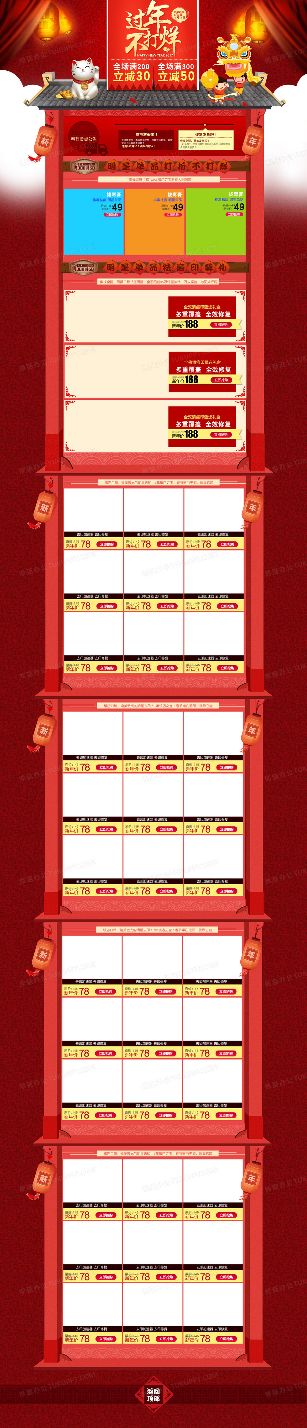 本作品内容为红色狂欢年货节化妆品店铺首页背景, 格式为 psd, 图片尺寸为1920 x 8908, 作品中背景图片无需修改, 源文件无水印,可以直接使用, 欢迎使用熊猫办公。 如认为平台内容涉嫌侵权,可通过邮件:tousu@tukuppt.com提出书面通知,我们将及时处理。