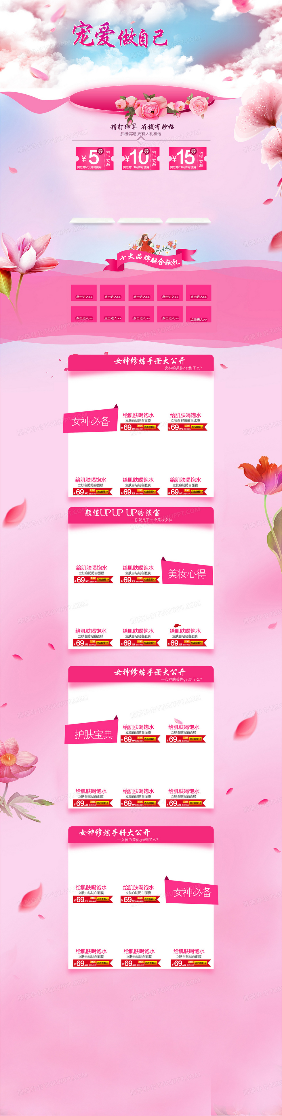 本作品内容为粉色花瓣浪漫情人节化妆品店铺首页背景, 格式为 psd, 图片尺寸为1920 x 7578, 作品中背景图片无需修改, 源文件无水印,可以直接使用, 欢迎使用熊猫办公。 如认为平台内容涉嫌侵权,可通过邮件:tousu@tukuppt.com提出书面通知,我们将及时处理。
