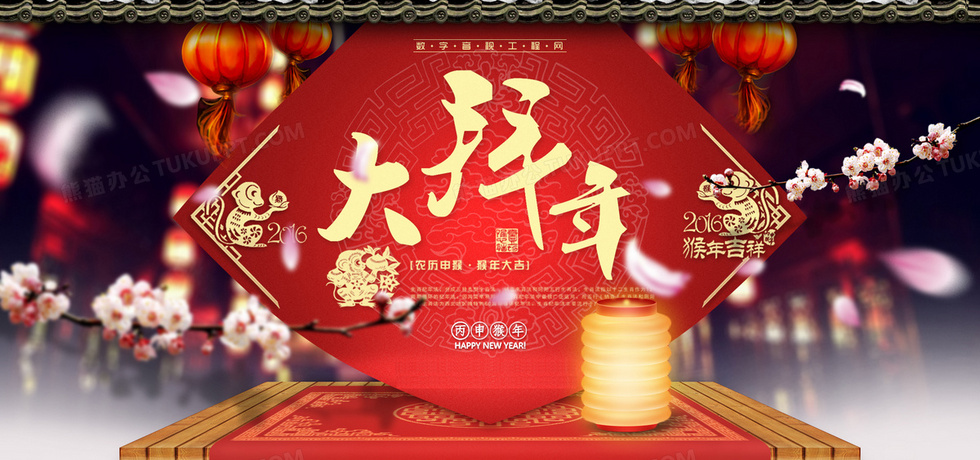 本作品内容为淘宝新年大拜年首页图, 格式为 jpg, 图片尺寸为1920 x 900, 作品中背景图片无需修改, 源文件无水印,可以直接使用, 欢迎使用熊猫办公。 如认为平台内容涉嫌侵权,可通过邮件:tousu@tukuppt.com提出书面通知,我们将及时处理。