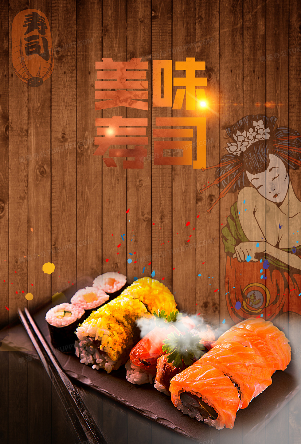 本作品内容为日式寿司背景素材, 格式为 psd, 图片尺寸为2525 x 3725, 作品中背景图片无需修改, 源文件无水印,可以直接使用, 欢迎使用熊猫办公。 如认为平台内容涉嫌侵权,可通过邮件:tousu@tukuppt.com提出书面通知,我们将及时处理。