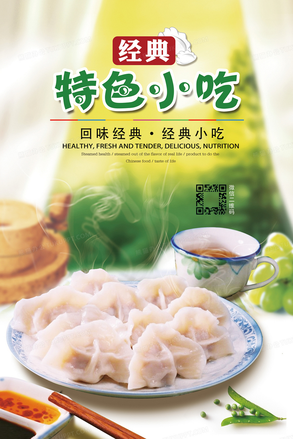 本作品内容为绿色特色小吃水饺餐饮海报, 格式为 psd, 图片尺寸为3543 x 5315, 作品中背景图片无需修改, 源文件无水印,可以直接使用, 欢迎使用熊猫办公。 如认为平台内容涉嫌侵权,可通过邮件:tousu@tukuppt.com提出书面通知,我们将及时处理。
