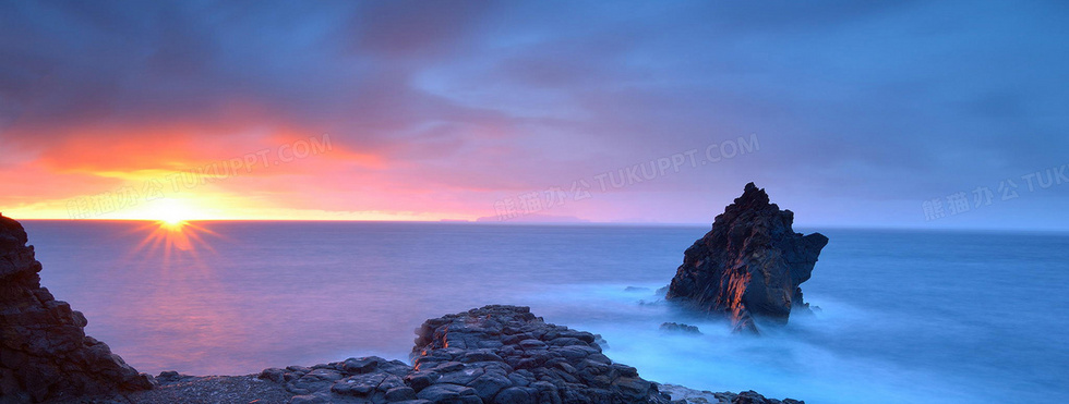本作品内容为黄昏梦幻大海礁石质感背景图, 格式为 jpg, 图片尺寸为1920 x 726, 作品中背景图片无需修改, 源文件无水印,可以直接使用, 欢迎使用熊猫办公。 如认为平台内容涉嫌侵权,可通过邮件:tousu@tukuppt.com提出书面通知,我们将及时处理。