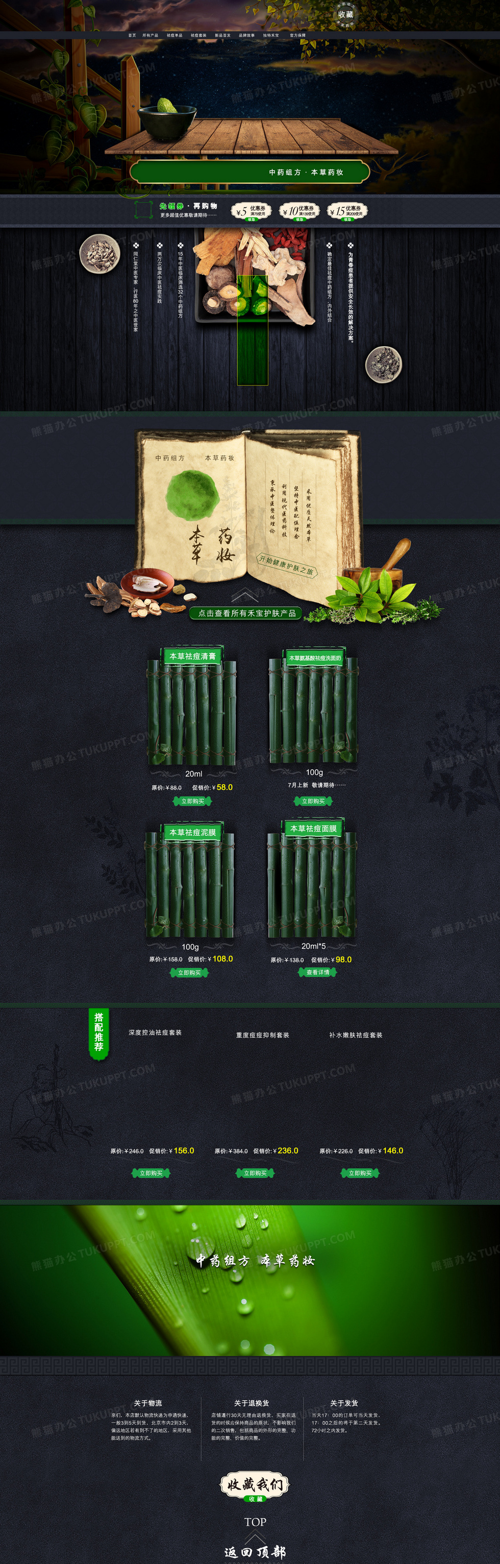本作品内容为绿色大气本草药妆化妆品店铺首页背景, 格式为 psd, 图片尺寸为1920 x 6000, 作品中背景图片无需修改, 源文件无水印,可以直接使用, 欢迎使用熊猫办公。 如认为平台内容涉嫌侵权,可通过邮件:tousu@tukuppt.com提出书面通知,我们将及时处理。