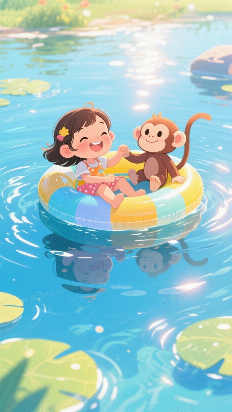 本作品内容为卡通风格的夏天插画可爱小女孩和一只小猴子在水面的气垫上, 格式为 jpg, 大小1 MB, 图片尺寸为936 x 1664, 源文件无水印, 欢迎使用熊猫办公。 如认为平台内容涉嫌侵权,可通过邮件:tousu@tukuppt.com提出书面通知,我们将及时处理。