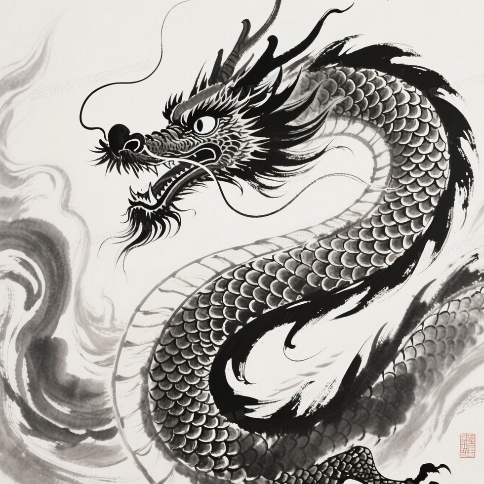 本作品内容为一条动态升腾的黑白中国龙, 格式为 jpg, 大小1 MB, 图片尺寸为1328 x 1328, 源文件无水印, 欢迎使用熊猫办公。 如认为平台内容涉嫌侵权,可通过邮件:tousu@tukuppt.com提出书面通知,我们将及时处理。