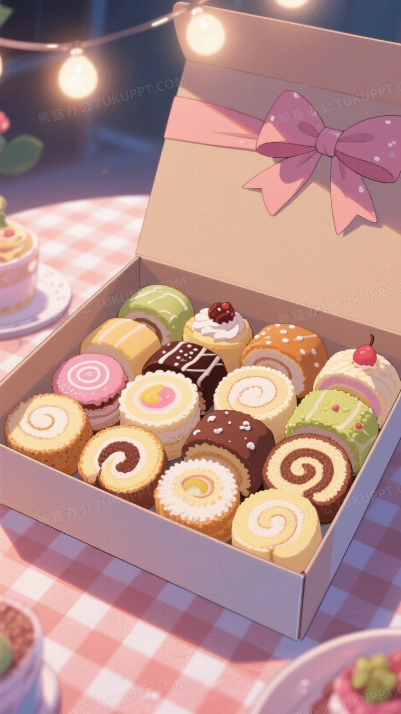 本作品内容为动漫插画特写一个纸盒子里装着各式各样的各种类型各种款式的瑞士卷蛋糕, 格式为 jpg, 大小1 MB, 图片尺寸为936 x 1664, 源文件无水印, 欢迎使用熊猫办公。 如认为平台内容涉嫌侵权,可通过邮件:tousu@tukuppt.com提出书面通知,我们将及时处理。