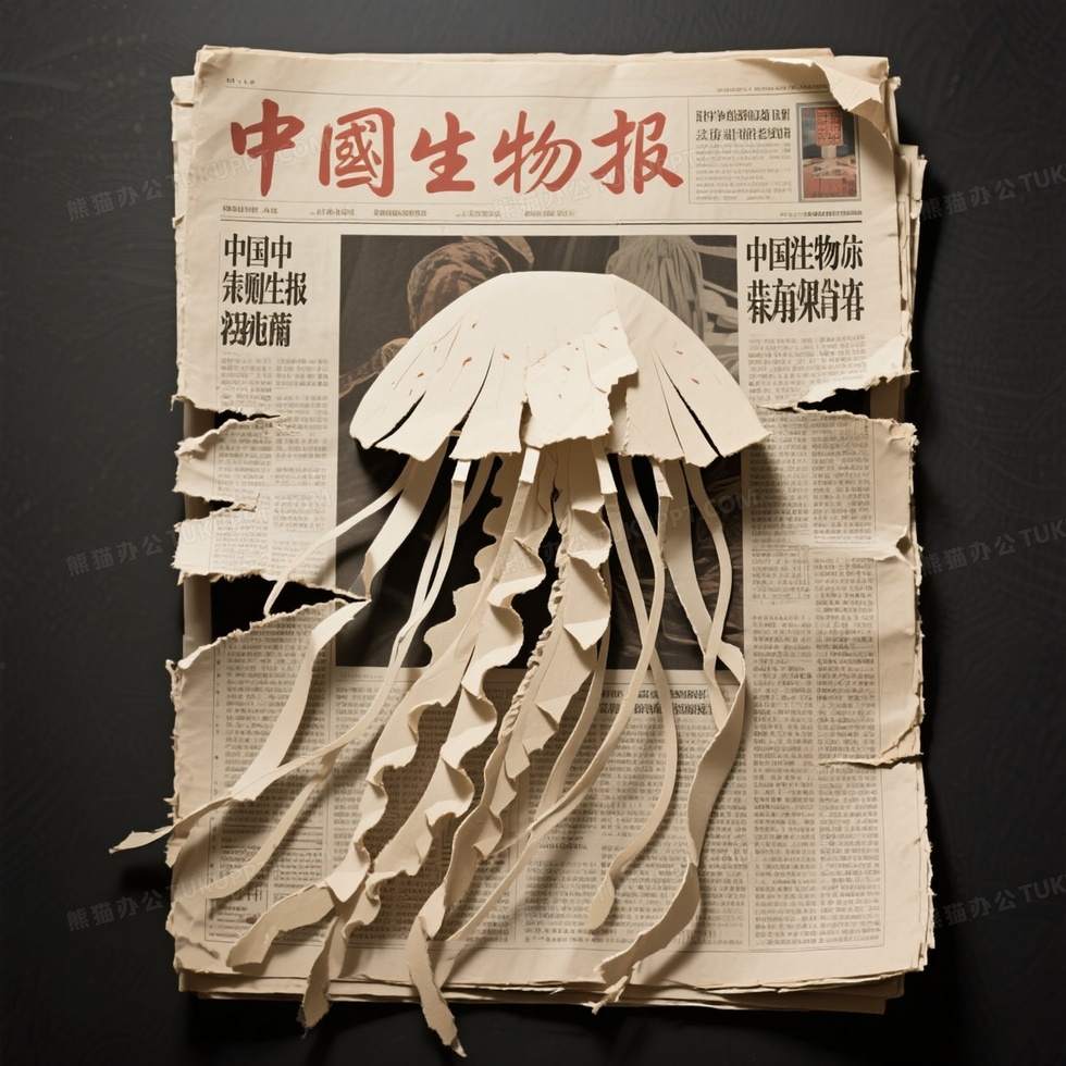 本作品内容为报纸手撕出水母形象中国生物报报纸, 格式为 jpg, 大小1 MB, 图片尺寸为1328 x 1328, 源文件无水印, 欢迎使用熊猫办公。 如认为平台内容涉嫌侵权,可通过邮件:tousu@tukuppt.com提出书面通知,我们将及时处理。