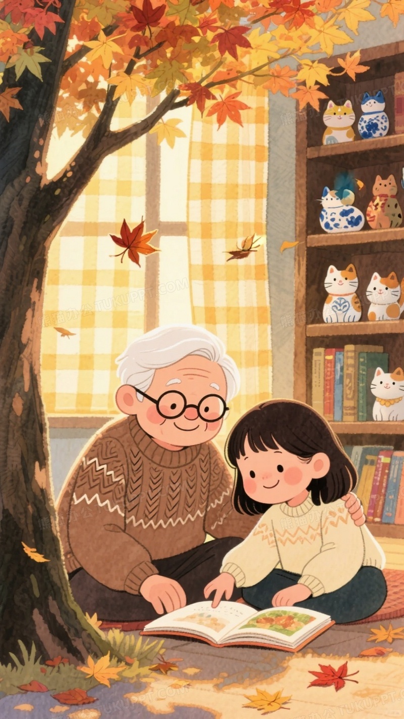 本作品内容为卡通插画描绘白发老人与孙女在枫树下读绘本, 格式为 jpg, 大小1 MB, 图片尺寸为936 x 1664, 源文件无水印, 欢迎使用熊猫办公。 如认为平台内容涉嫌侵权,可通过邮件:tousu@tukuppt.com提出书面通知,我们将及时处理。