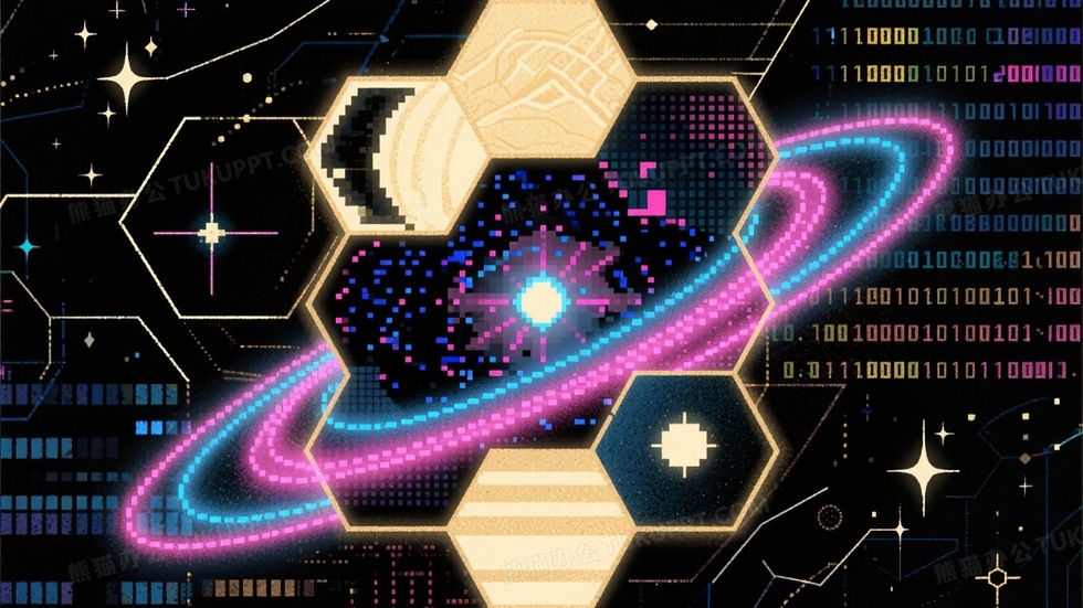 本作品内容为抽象几何银河系插画六边形模块拼接行星环, 格式为 jpg, 大小1 MB, 图片尺寸为1664 x 936, 源文件无水印, 欢迎使用熊猫办公。 如认为平台内容涉嫌侵权,可通过邮件:tousu@tukuppt.com提出书面通知,我们将及时处理。