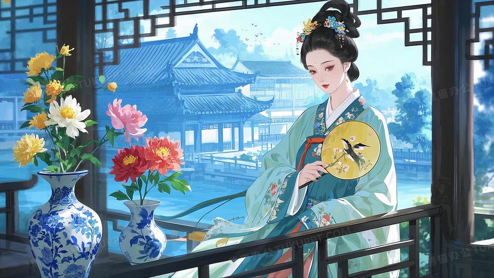 首页 > 插画 > 科技艺术 > 国潮风 > 国潮风上巳节汉服古风牡丹花场景插画