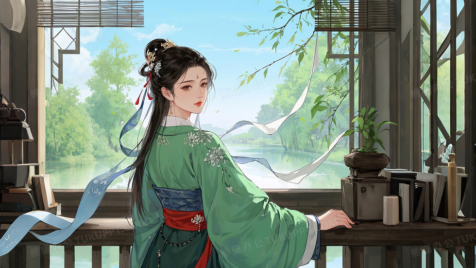 本作品内容为窗边的古风美女小说封面卡通插画, 格式为 jpg, 大小5 MB, 图片尺寸为3640 x 2048, 源文件无水印, 欢迎使用熊猫办公。 如认为平台内容涉嫌侵权,可通过邮件:tousu@tukuppt.com提出书面通知,我们将及时处理。