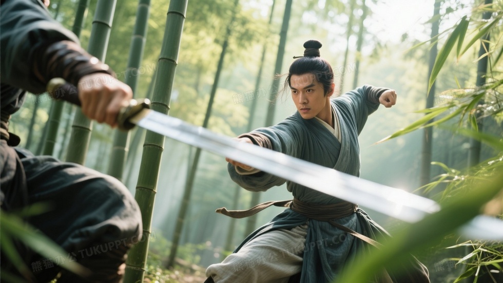 本作品内容为一位身着古装的侠客手持长剑在竹林中与对手激烈打斗, 格式为 jpg, 大小1 MB, 图片尺寸为1664 x 936, 源文件无水印, 欢迎使用熊猫办公。 如认为平台内容涉嫌侵权,可通过邮件:tousu@tukuppt.com提出书面通知,我们将及时处理。