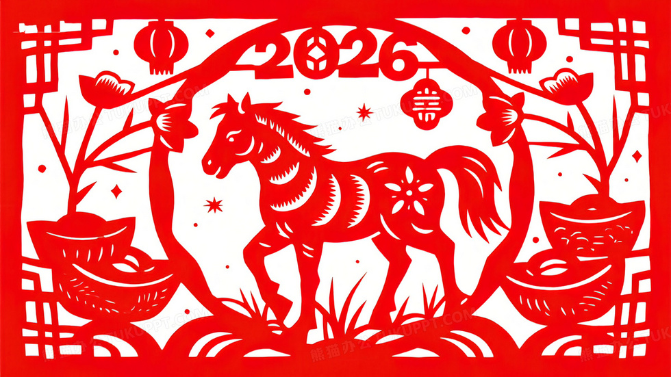 本作品内容为马年春节红色剪纸风喜庆插画, 格式为 jpg, 大小5 MB, 图片尺寸为3328 x 1872, 源文件无水印, 欢迎使用熊猫办公。 如认为平台内容涉嫌侵权,可通过邮件:tousu@tukuppt.com提出书面通知,我们将及时处理。
