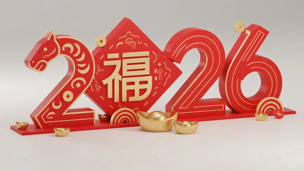 本作品内容为马年春节3D红色喜庆数字2026插画, 格式为 jpg, 大小5 MB, 图片尺寸为3328 x 1872, 源文件无水印, 欢迎使用熊猫办公。 如认为平台内容涉嫌侵权,可通过邮件:tousu@tukuppt.com提出书面通知,我们将及时处理。