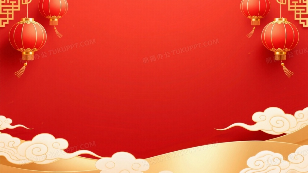 本作品内容为中国春节红金背景底部是装饰着浮云, 格式为 jpg, 大小1 MB, 图片尺寸为1664 x 936, 作品中背景图片无需修改, 源文件无水印,可以直接使用, 欢迎使用熊猫办公。 如认为平台内容涉嫌侵权,可通过邮件:tousu@tukuppt.com提出书面通知,我们将及时处理。
