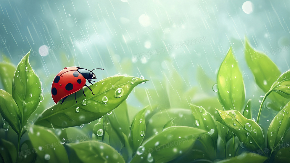 本作品内容为树叶甲虫春天下雨风景插画, 格式为 jpg, 大小3 MB, 图片尺寸为2912 x 1632, 源文件无水印, 欢迎使用熊猫办公。 如认为平台内容涉嫌侵权,可通过邮件:tousu@tukuppt.com提出书面通知,我们将及时处理。