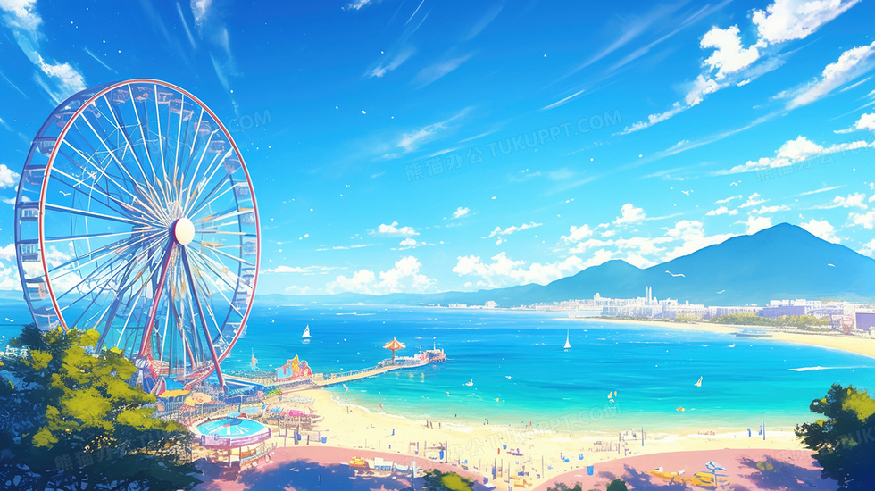 本作品内容为蓝色海边摩天岭天空插画, 格式为 jpg, 大小3 MB, 图片尺寸为2912 x 1632, 源文件无水印, 欢迎使用熊猫办公。 如认为平台内容涉嫌侵权,可通过邮件:tousu@tukuppt.com提出书面通知,我们将及时处理。