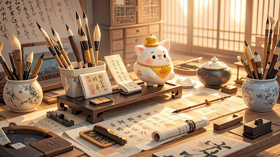 本作品内容为毛笔宣纸传统文化笔墨纸砚插画, 格式为 jpg, 大小5 MB, 图片尺寸为3072 x 1728, 源文件无水印, 欢迎使用熊猫办公。 如认为平台内容涉嫌侵权,可通过邮件:tousu@tukuppt.com提出书面通知,我们将及时处理。