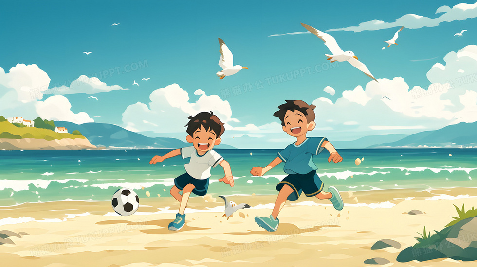 本作品内容为卡通动画两个小男孩在沙滩上踢足球插画, 格式为 jpg, 大小2 MB, 图片尺寸为2912 x 1632, 源文件无水印, 欢迎使用熊猫办公。 如认为平台内容涉嫌侵权,可通过邮件:tousu@tukuppt.com提出书面通知,我们将及时处理。