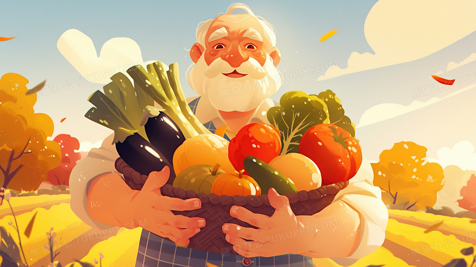 本作品内容为瓜果果蔬大丰收开心抱胸前开心的农民伯伯插画, 格式为 jpg, 大小2 MB, 图片尺寸为2912 x 1632, 源文件无水印, 欢迎使用熊猫办公。 如认为平台内容涉嫌侵权,可通过邮件:tousu@tukuppt.com提出书面通知,我们将及时处理。