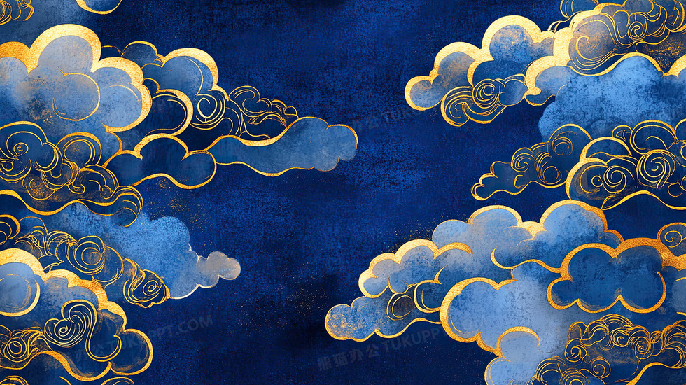 本作品内容为蓝色烫金风祥云背景, 格式为 jpg, 大小9 MB, 图片尺寸为2912 x 1632, 作品中背景图片无需修改, 源文件无水印,可以直接使用, 欢迎使用熊猫办公。 如认为平台内容涉嫌侵权,可通过邮件:tousu@tukuppt.com提出书面通知,我们将及时处理。