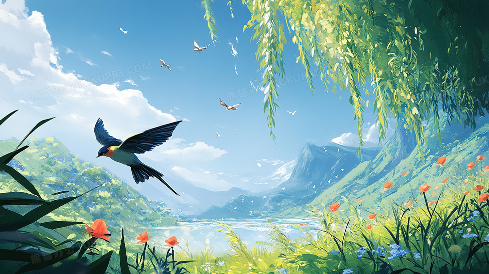 本作品内容为春季户外山谷间柳树与燕子插画, 格式为 jpg, 大小4 MB, 图片尺寸为2912 x 1632, 源文件无水印, 欢迎使用熊猫办公。 如认为平台内容涉嫌侵权,可通过邮件:tousu@tukuppt.com提出书面通知,我们将及时处理。