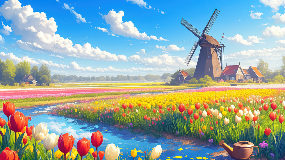 本作品内容为唯美风荷兰风车转动郁金香花田的插画, 格式为 jpg, 大小4 MB, 图片尺寸为2912 x 1632, 源文件无水印, 欢迎使用熊猫办公。 如认为平台内容涉嫌侵权,可通过邮件:tousu@tukuppt.com提出书面通知,我们将及时处理。