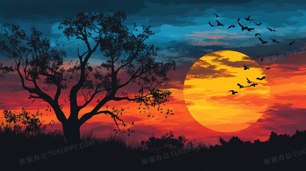 本作品内容为剪影风户外美丽的日出日落插画, 格式为 jpg, 大小3 MB, 图片尺寸为2912 x 1632, 源文件无水印, 欢迎使用熊猫办公。 如认为平台内容涉嫌侵权,可通过邮件:tousu@tukuppt.com提出书面通知,我们将及时处理。