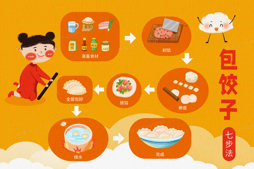 本作品内容为彩色卡通小朋友包饺子步骤制作插画, 格式为 psd, 大小64 MB, 请使用软件PhotoShop(CC)打开, 源文件无水印, 欢迎使用熊猫办公。 如认为平台内容涉嫌侵权,可通过邮件:tousu@tukuppt.com提出书面通知,我们将及时处理。