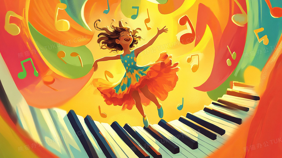 本作品内容为钢琴键上跳舞的小女孩卡通插画, 格式为 jpg, 大小3 MB, 图片尺寸为2912 x 1632, 源文件无水印, 欢迎使用熊猫办公。 如认为平台内容涉嫌侵权,可通过邮件:tousu@tukuppt.com提出书面通知,我们将及时处理。