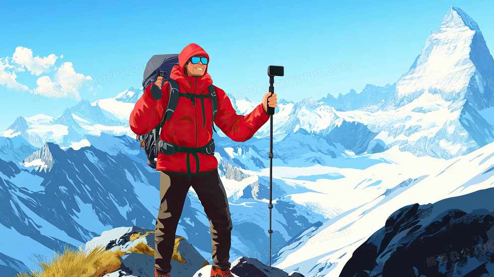 本作品内容为雪山上拍照的人插画, 格式为 jpg, 大小3 MB, 图片尺寸为2912 x 1632, 源文件无水印, 欢迎使用熊猫办公。 如认为平台内容涉嫌侵权,可通过邮件:tousu@tukuppt.com提出书面通知,我们将及时处理。