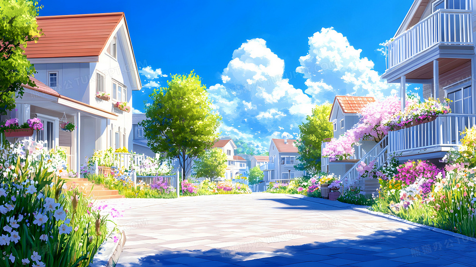 首页 > 插画 > 科技艺术 > 唯美清新 > 插画风格春天街区小巷阳台花蒲蓝天白云唯美场景