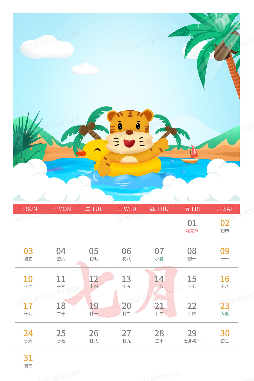 本作品内容为2022虎年日历七月份插画背景, 格式为 psd, 大小10 MB, 图片尺寸为3543 x 5315, 作品中背景图片无需修改, 源文件无水印,可以直接使用, 欢迎使用熊猫办公。 如认为平台内容涉嫌侵权,可通过邮件:tousu@tukuppt.com提出书面通知,我们将及时处理。