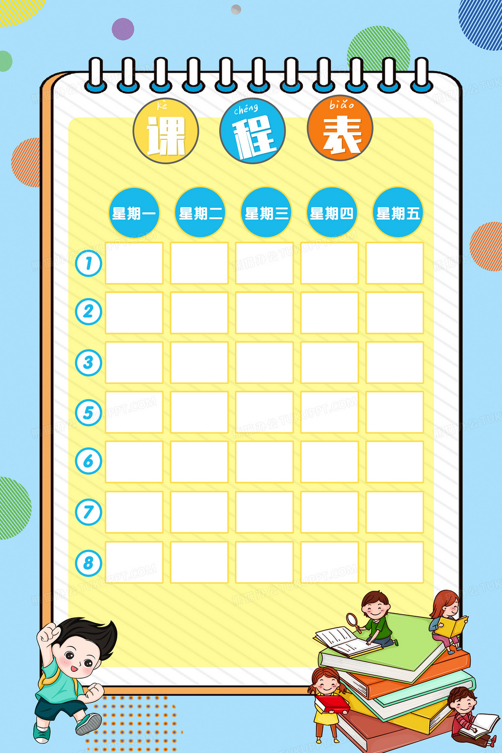 本作品内容为卡通风新学期课程表背景, 格式为 psd, 大小32 MB, 图片尺寸为3542 x 5315, 作品中背景图片无需修改, 源文件无水印,可以直接使用, 欢迎使用熊猫办公。 如认为平台内容涉嫌侵权,可通过邮件:tousu@tukuppt.com提出书面通知,我们将及时处理。