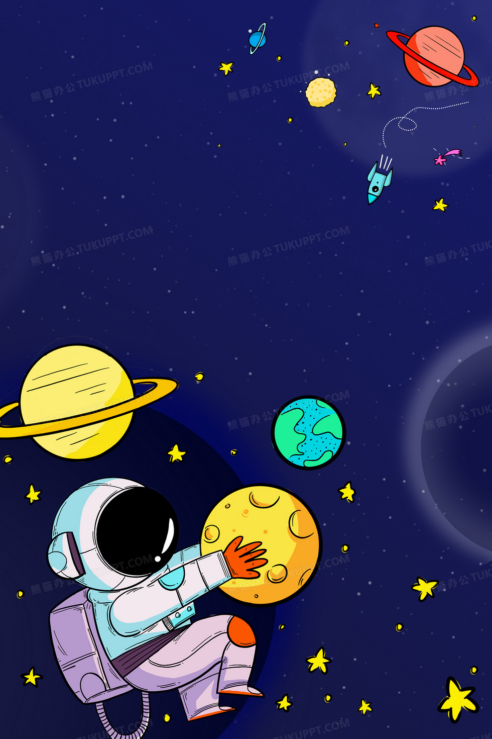 本作品内容为蓝色宇宙宇航员卡通星球背景, 格式为 psd, 大小43 MB, 图片尺寸为3543 x 5314, 作品中背景图片无需修改, 源文件无水印,可以直接使用, 欢迎使用熊猫办公。 如认为平台内容涉嫌侵权,可通过邮件:tousu@tukuppt.com提出书面通知,我们将及时处理。