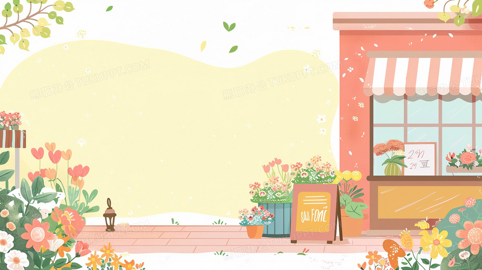 本作品内容为卡通花店电商促销宣传消费背景, 格式为 jpg, 大小2 MB, 图片尺寸为2912 x 1632, 作品中背景图片无需修改, 源文件无水印,可以直接使用, 欢迎使用熊猫办公。 如认为平台内容涉嫌侵权,可通过邮件:tousu@tukuppt.com提出书面通知,我们将及时处理。