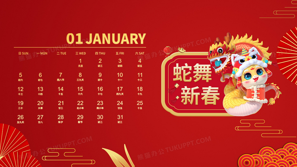 本作品内容为2025新年蛇年一月日历插画, 格式为 psd, 大小34 MB, 请使用软件PhotoShop(CS6)打开, 源文件无水印, 欢迎使用熊猫办公。 如认为平台内容涉嫌侵权,可通过邮件:tousu@tukuppt.com提出书面通知,我们将及时处理。