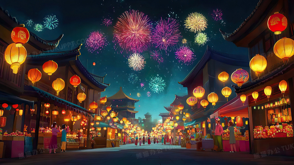 本作品内容为元宵节花灯集市插画, 格式为 jpg, 大小4 MB, 图片尺寸为2912 x 1632, 源文件无水印, 欢迎使用熊猫办公。 如认为平台内容涉嫌侵权,可通过邮件:tousu@tukuppt.com提出书面通知,我们将及时处理。