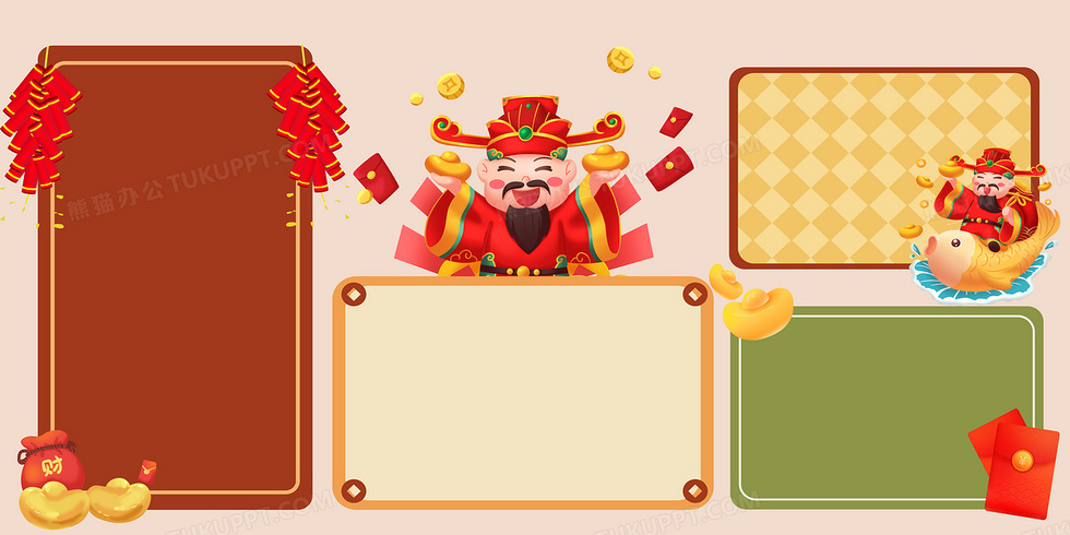 本作品内容为新年喜庆财神分区壁纸背景, 格式为 psd, 大小15 MB, 图片尺寸为4724 x 2362, 作品中背景图片无需修改, 源文件无水印,可以直接使用, 欢迎使用熊猫办公。 如认为平台内容涉嫌侵权,可通过邮件:tousu@tukuppt.com提出书面通知,我们将及时处理。