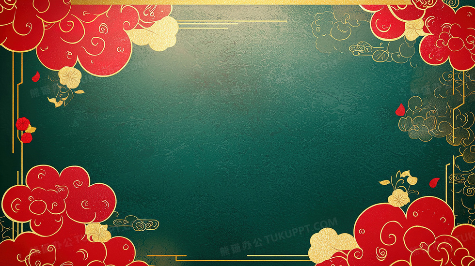 本作品内容为复古祥云边框墨绿色创意背景, 格式为 jpg, 大小4 MB, 图片尺寸为2912 x 1632, 作品中背景图片无需修改, 源文件无水印,可以直接使用, 欢迎使用熊猫办公。 如认为平台内容涉嫌侵权,可通过邮件:tousu@tukuppt.com提出书面通知,我们将及时处理。