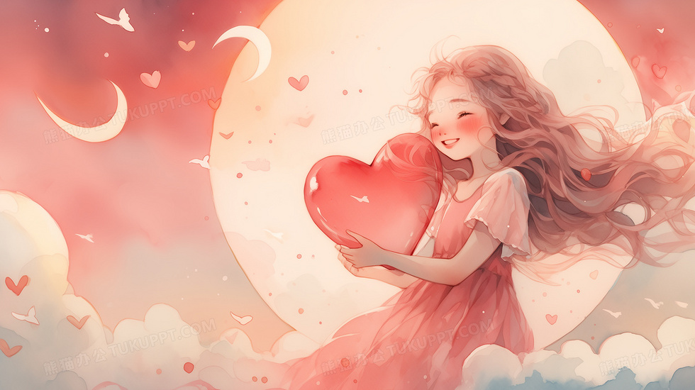 本作品内容为一个女孩抱着一颗爱心唯美插画, 格式为 jpg, 大小5 MB, 图片尺寸为2912 x 1632, 源文件无水印, 欢迎使用熊猫办公。 如认为平台内容涉嫌侵权,可通过邮件:tousu@tukuppt.com提出书面通知,我们将及时处理。