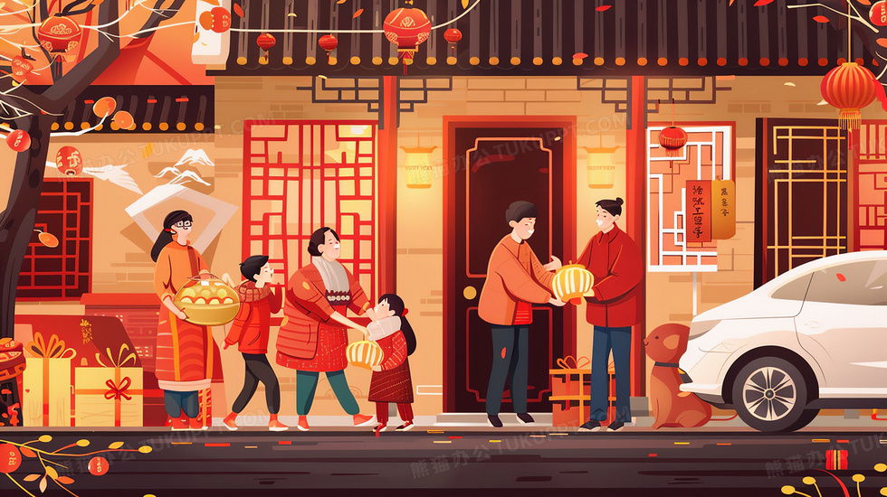 春节人们带着礼物来到亲戚家门口走亲戚插画