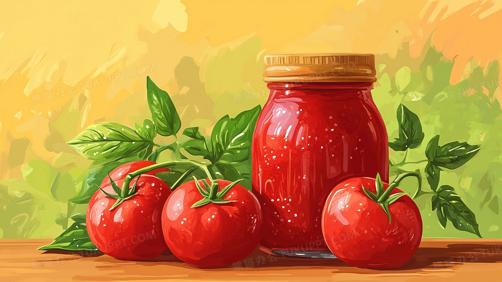 本作品内容为农副产品番茄与一瓶番茄酱插画, 格式为 jpg, 大小3 MB, 图片尺寸为2912 x 1632, 源文件无水印, 欢迎使用熊猫办公。 如认为平台内容涉嫌侵权,可通过邮件:tousu@tukuppt.com提出书面通知,我们将及时处理。