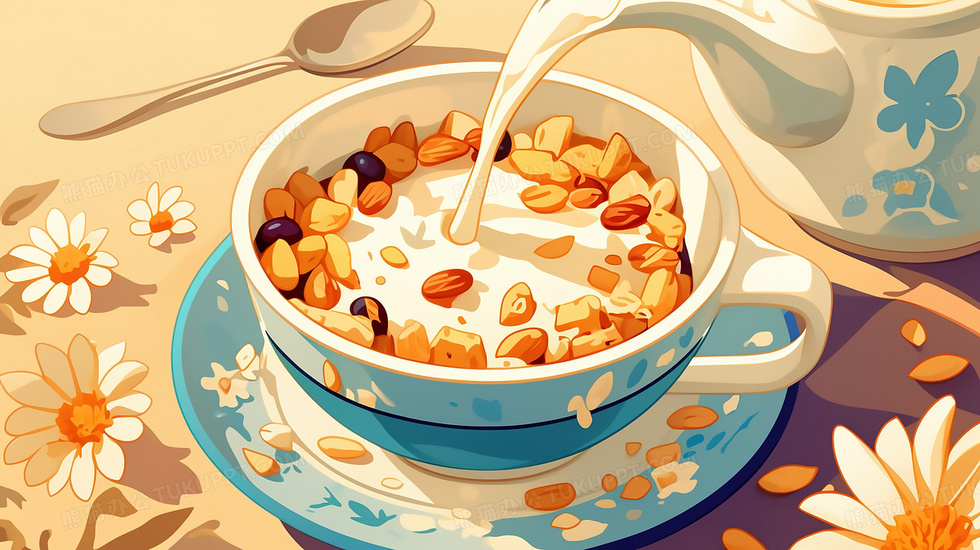 本作品内容为卡通牛奶泡水果坚果早餐零食插画, 格式为 jpg, 大小3 MB, 图片尺寸为2912 x 1632, 源文件无水印, 欢迎使用熊猫办公。 如认为平台内容涉嫌侵权,可通过邮件:tousu@tukuppt.com提出书面通知,我们将及时处理。