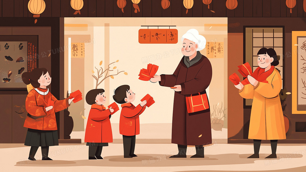 本作品内容为新年长辈发红包插画, 格式为 jpg, 大小3 MB, 图片尺寸为2912 x 1632, 源文件无水印, 欢迎使用熊猫办公。 如认为平台内容涉嫌侵权,可通过邮件:tousu@tukuppt.com提出书面通知,我们将及时处理。