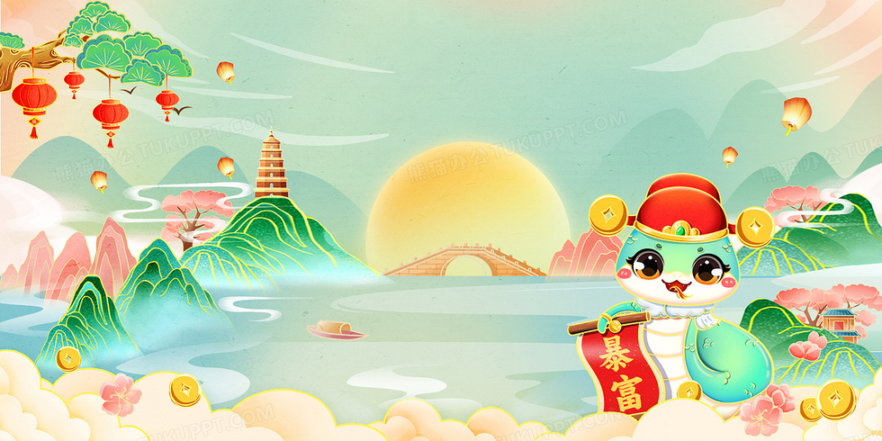 本作品内容为中国风新年国潮山水蛇年吉祥物2025新年背景, 格式为 psd, 大小68 MB, 图片尺寸为4724 x 2362, 作品中背景图片无需修改, 源文件无水印,可以直接使用, 欢迎使用熊猫办公。 如认为平台内容涉嫌侵权,可通过邮件:tousu@tukuppt.com提出书面通知,我们将及时处理。