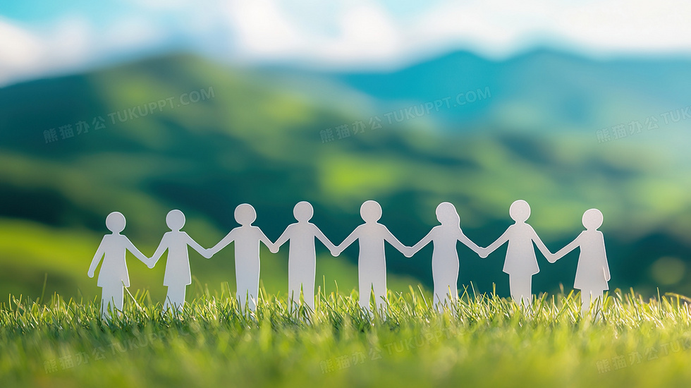 本作品内容为草地上手拉手的纸片人物创意背景, 格式为 jpg, 大小2 MB, 图片尺寸为2912 x 1632, 作品中背景图片无需修改, 源文件无水印,可以直接使用, 欢迎使用熊猫办公。 如认为平台内容涉嫌侵权,可通过邮件:tousu@tukuppt.com提出书面通知,我们将及时处理。